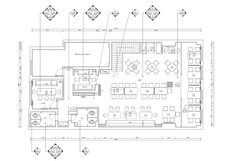 4、餐廳照明:一家有出色的燈光設計的餐廳可以給顧客帶來視覺與味覺的雙重享受,讓人身心愉悅。好的燈光設計,可以增加食物質感,還原食材的真實顏色從而激發顧客的食欲。炙成一派采用了3500K色溫照明,在燈光照耀下,展現牛羊肉的新鮮肉質感,同時偏暖的光源也營造出溫馨、舒適的就餐環境。在燈具的選擇上,我們使用了與空間裝飾風格想匹配的工業風蠟燭吊燈,而在靠窗一側,則使用了垂釣而下的絲帶燈,顧客在用餐之余仿佛將自己置于星星閃爍的蒼穹星空之下,非常有情趣。