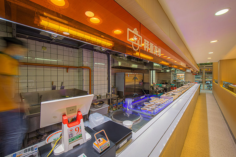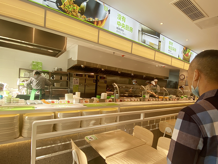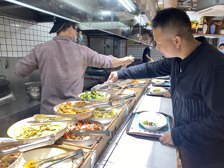 顧客進門洗手,取餐盤自助選菜,找位置就餐,餐具回收,整個動線清晰流暢,運作一氣呵成。選菜臺的設計非常驚艷,30多到菜品排列成一行,在燈光照射,非常有吸引力。讓消費者產生一種想全部吃一遍的沖動,進而胃口大開,長期光顧我們。