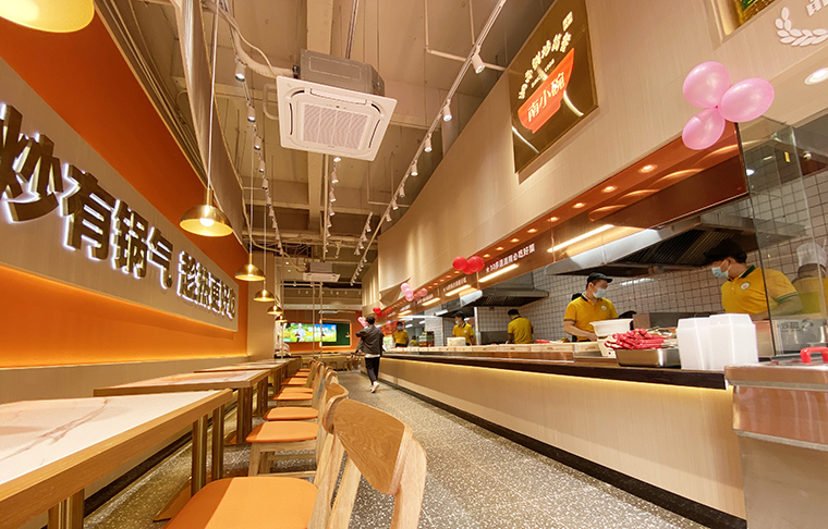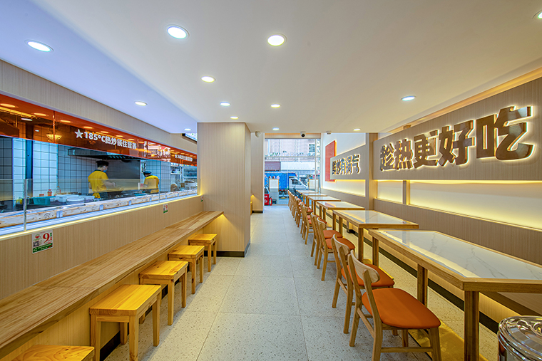門口大面積落地玻璃、墻面使用板材、白色大理石打菜臺、灰色地面、木色桌面,橙色亞克力板。整個空間追求明亮、整潔、舒適的視覺感受。尤其是門口的落地玻璃,窗明幾凈,讓路過的消費者都能看見店內熱火朝天的狀態(tài),鍋氣繚繞的煙火氣,產生強烈的進店沖動。