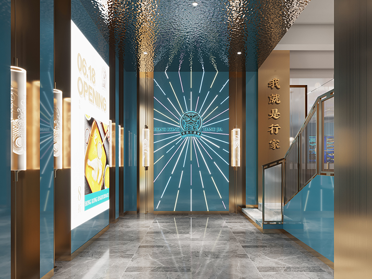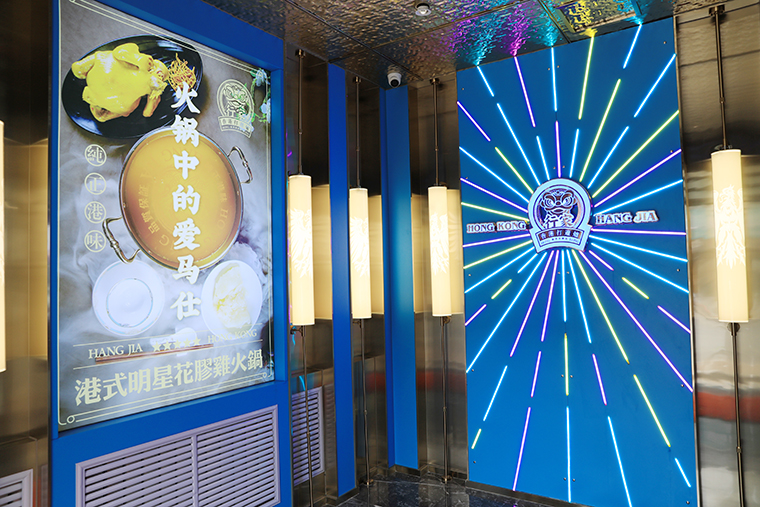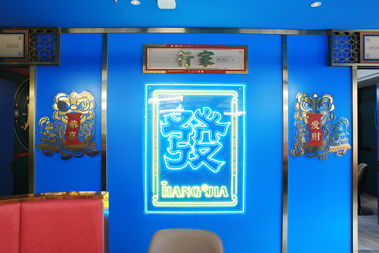 餐廳的主入口處,人流最密集之地,也是品牌首選的亮相之處。展現(xiàn)品牌主形象LOGO,以香港常見的霓虹燈材質(zhì),四周放射性線條,極具識別度,既有鮮明的港式風(fēng)格,又能吸引消費(fèi)者打卡拍照分享;上樓梯處再用不銹鋼金屬字強(qiáng)調(diào)品牌名字“我就是行家”;1樓大廳一整面墻的香港城市景色照片,讓消費(fèi)者有一種身臨其境的感受;二樓大廳正面形象墻以行家牌匾+立體浮雕醒獅,最經(jīng)典的港式匾額傳達(dá)花膠雞悠久厚重的歷史,兩側(cè)喜慶的南派醒獅,吉祥又可愛,與品牌LOGO彼此呼應(yīng)。